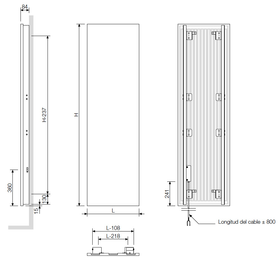 | Modelo | Código | Acabado | Alto (mm) H | Ancho (mm) L | Fondo desde la pared al extremo del radiador | Peso (kg) | Resistencia Eléctrica (W) | Precio / Unidad (€) |
