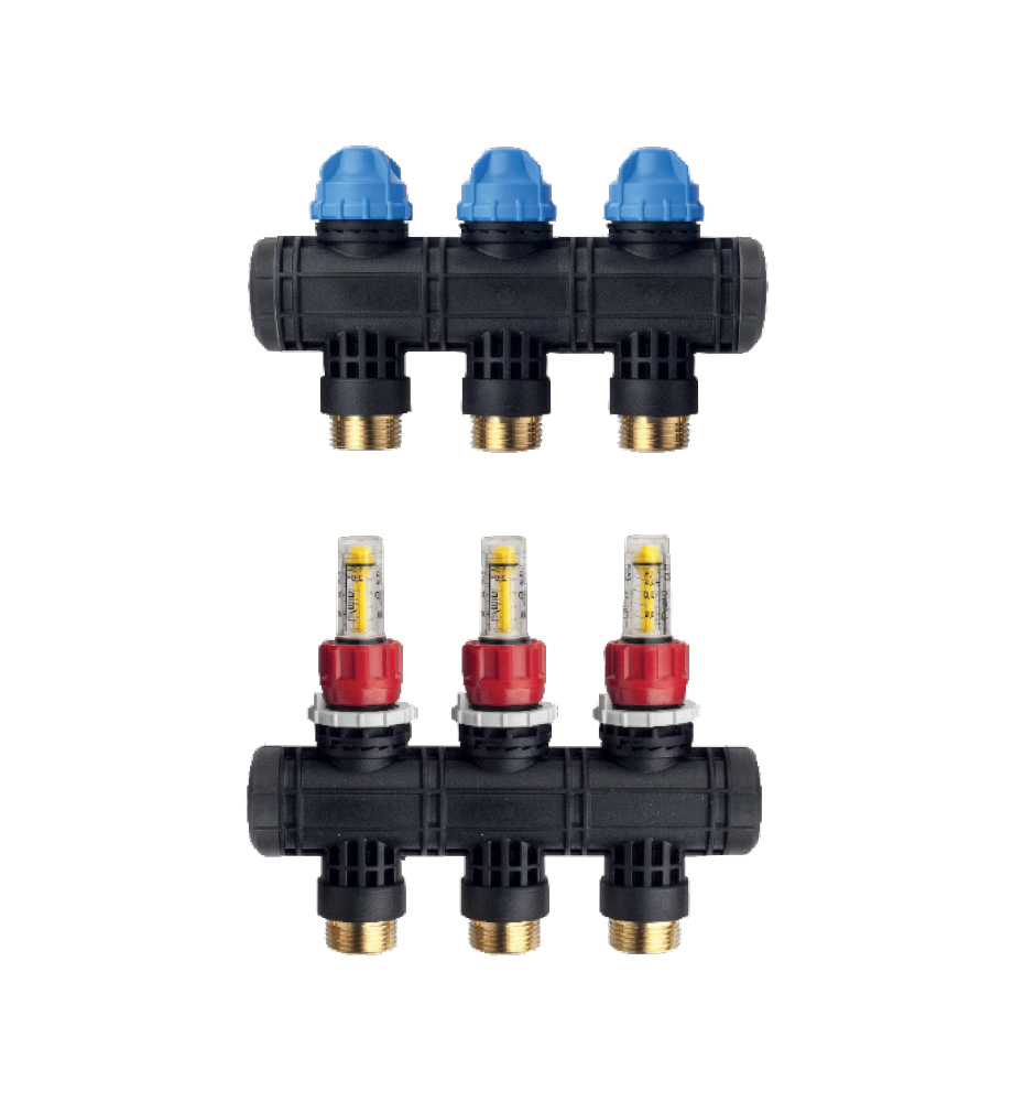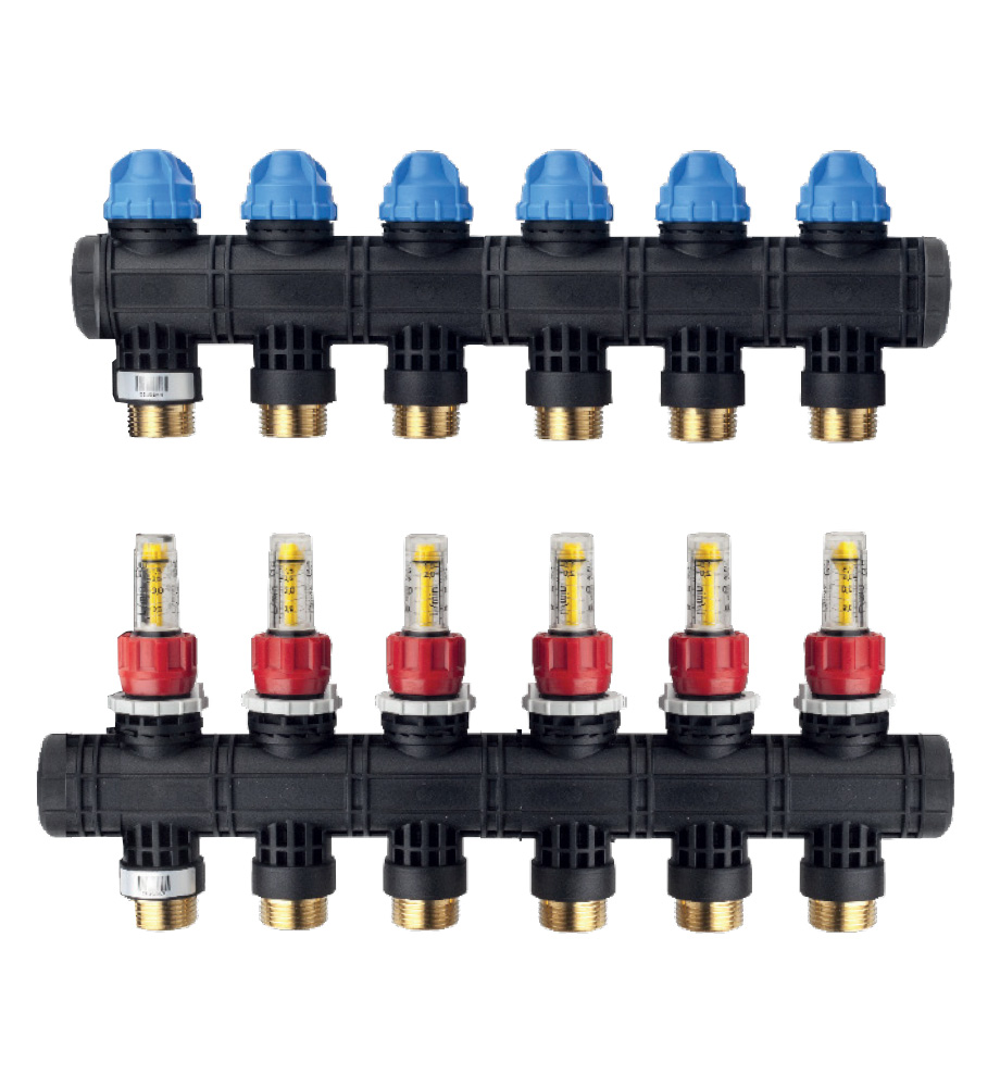 Colector modular de suelo radiante fabricado en poliamida. El colector se forma mediante la unión de conjuntos de 1, de 3 o de 6 salidas al que debe sumarse el kit colector y los euroconos.
